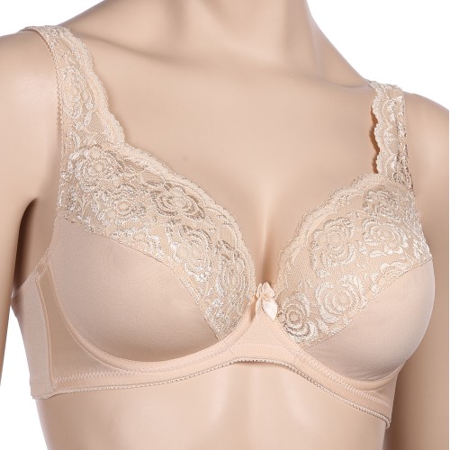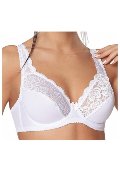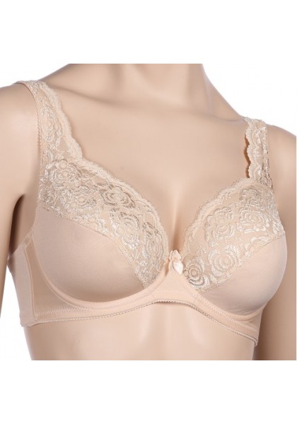 Бюстгальтер из эластичного полотна, на каркасах. Верхние детали чашек и бретели украшены эластичным кружевом, которое переходит на регулируемые бретели. Каркасы и широкие бретели обеспечивают идеальную поддержку груди. Нижние детали чашек и передние детали бюстгальтера из трикотажного полотна на подкладке. Боковые детали усилены пластинами. Все срезы бюстгальтера обработаны эластичной отделочной лентой. Застежка на крючки и петли. В центре декоративный бантик.