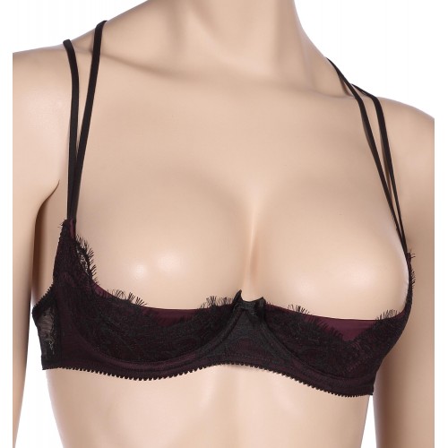 из дублированного полотна, покрытой эластичным полотном густого ягодного цвета и черным кружевом, на каркасах.  Особая форма лифа одновременно поддерживает и обнажает грудь. Боковые детали – из тонкого эластичного  полотна. Бретель эластичная, регулируемая. Все срезы обработаны эластичной отделочной лентой. Застежка на крючки и петли. Отделка бантик.