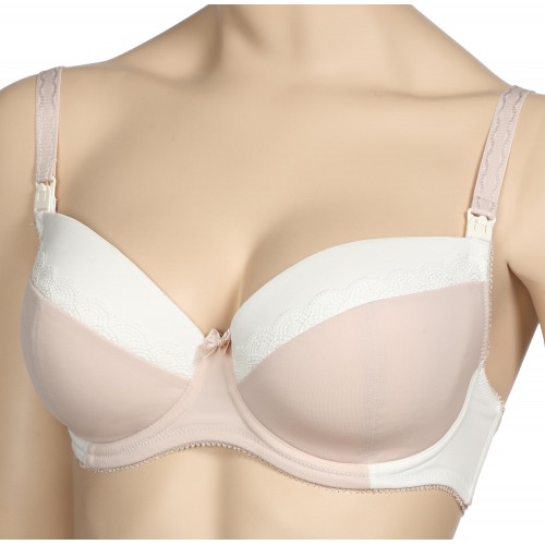 Бюстгальтер из двух цветов  мягкого эластичного полотна на каркасах предназначен для грудного вскармливания. Чашки на подкладке из дублированного полотна открываются полностью, обеспечивая малышу максимальный доступ к груди во время кормления. Декорированы чашки узким кружевом.  Узкие боковые детали усилены пластинами. Эластичные бретели с регулировкой  длины. Все срезы обработаны эластичной отделочной лентой. Застежка сзади на крючки и петли. Отделка декоративный бантик.