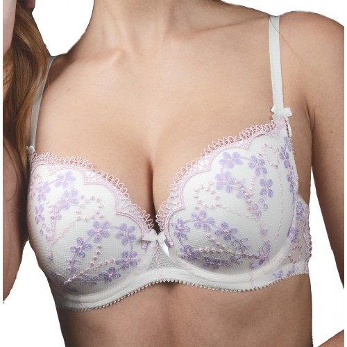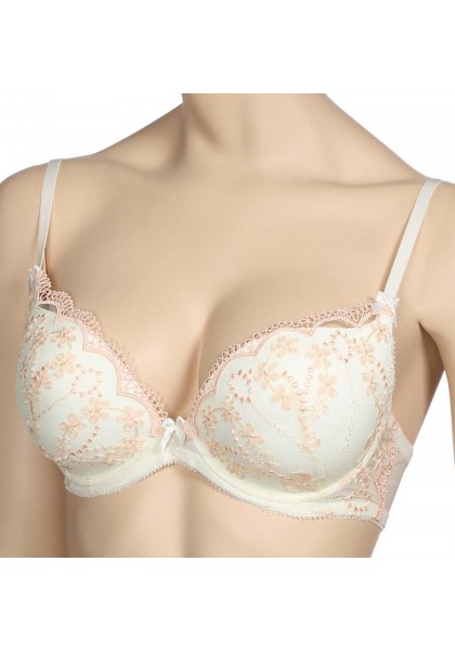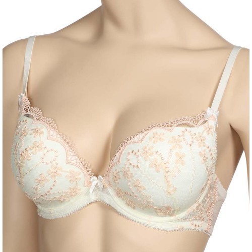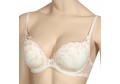 Эластичный бюстгальтер на каркасах. Формованные чашки PUSH UP обеспечивает полный комфорт при носке. Особую прелесть этому бюстгальтеру придает нежное высококачественное кружево в стиле «Прованс». Оно украшает чашки и нежно «переходит» на боковые детали. Эластичные бретели с фиксаторами длины украшены декоративными бантиками. Застежка сзади на крючки и петли.