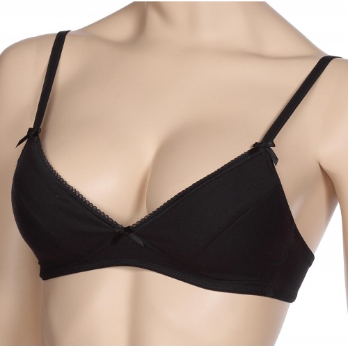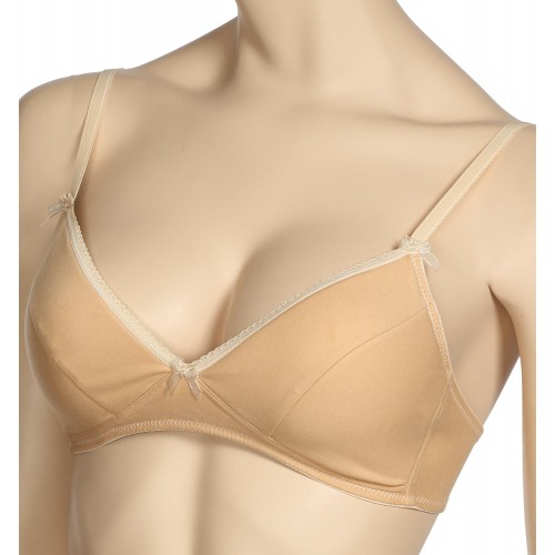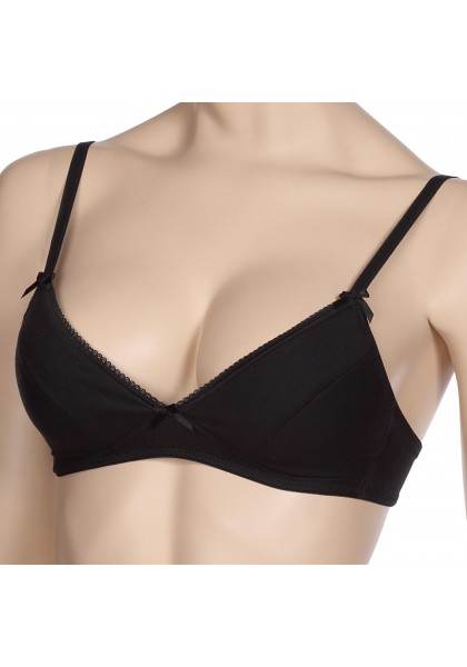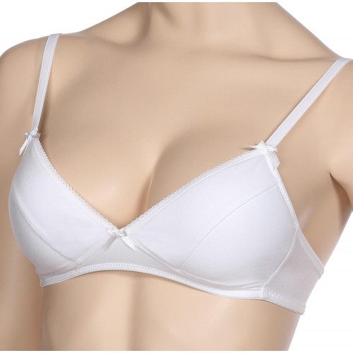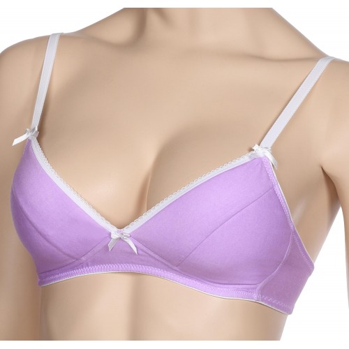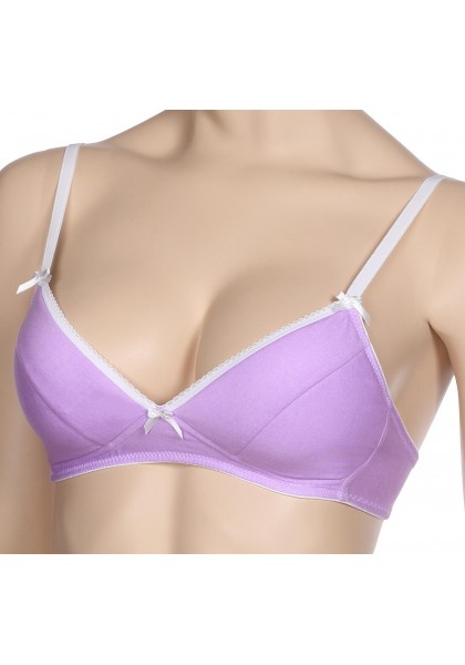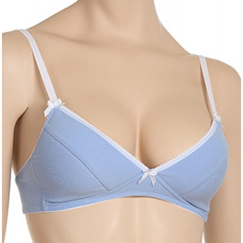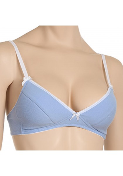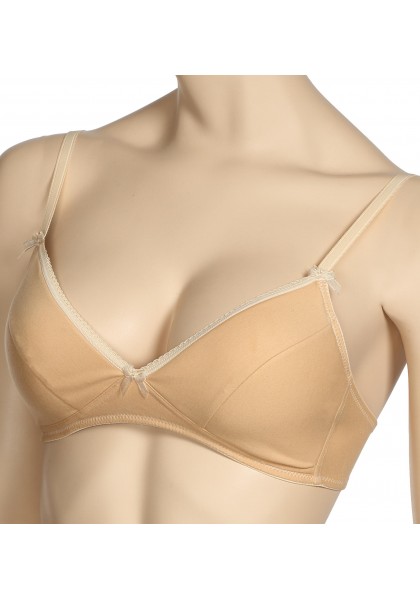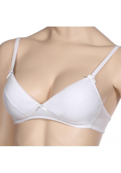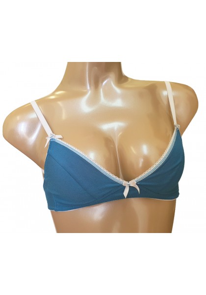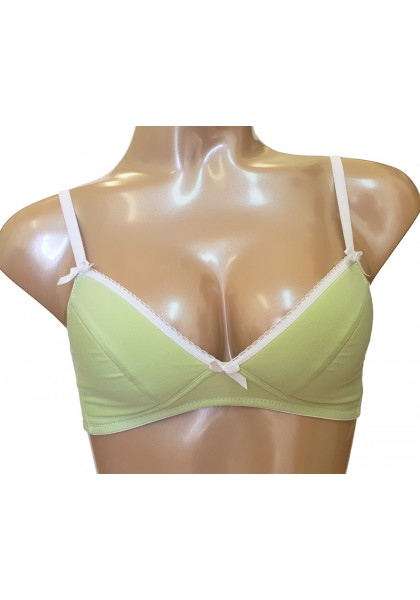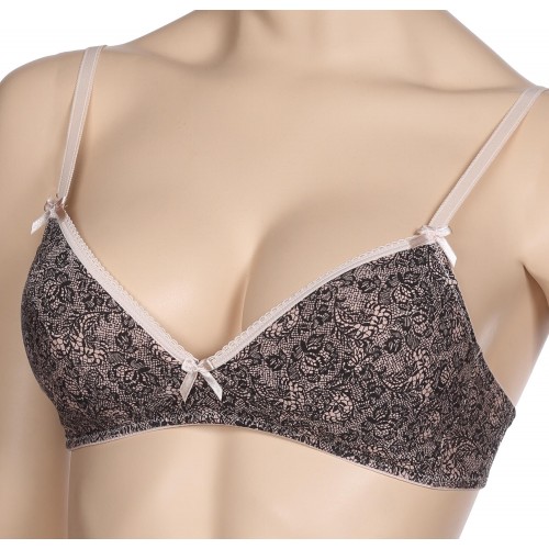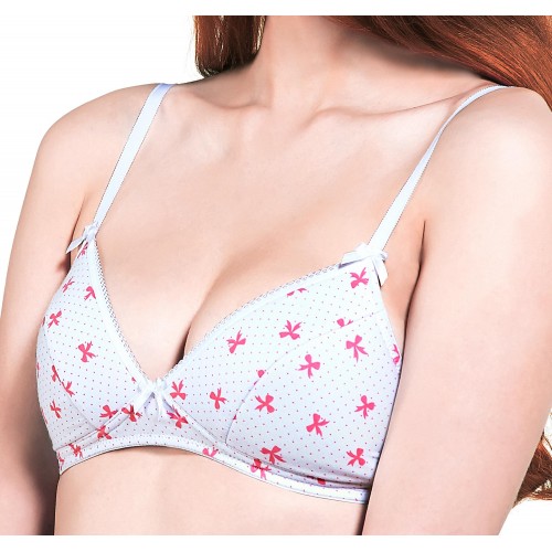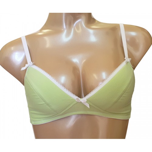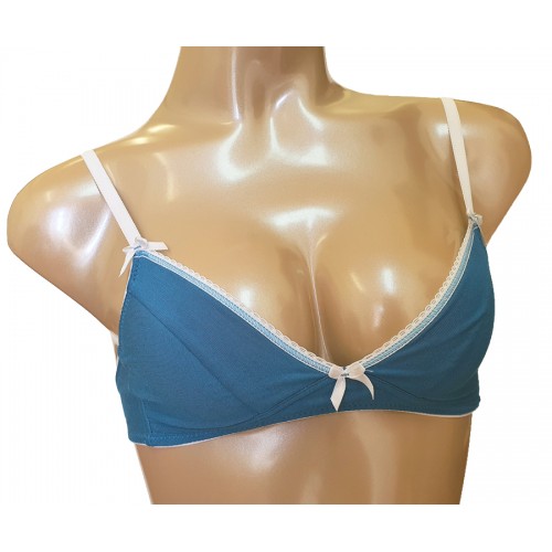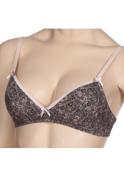 Бюстгальтер из хлопчатобумажного принтованного трикотажного полотна с полиуретаном. Чашка состоит из двух деталей на дублированном полотне. Бретель эластичная с регулятором длины. Застежка сзади на крючки и петли. Декоративная отделка- три милых бантика.