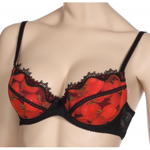 цветом кружева с принтом в виде сочных ягод клубники и черными ажурными мотивами по верхнему краю