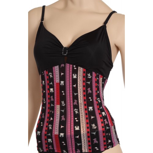 Топ из двух видов эластичных полотен. Часть передней детали на подкладке из эластичного полотна с готовой формованной чашкой. Бретели эластичные с регулятором длины. На передней детали топа украшение в форме пряжки. Нижний срез топа обработан швом в подгибку.