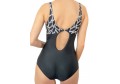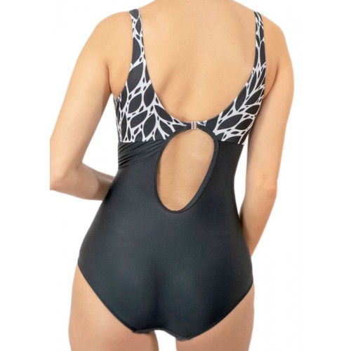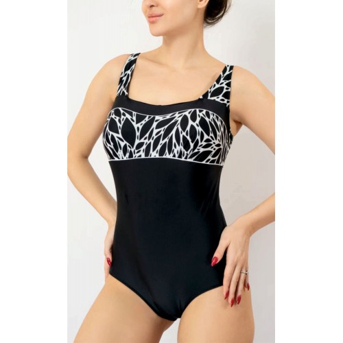Купальник без каркасов, комбинированный из  двух видов эластичных полотен: однотонного и с принтом. Отрезной лиф обрамлен сверху и снизу кантами контрастного цвета. Кокетка разделяет верх лифа и широкие бретели из основного полотна. Передние детали купальника – на подкладке. Круглый вырез на спине фиксируется металлической застежкой.