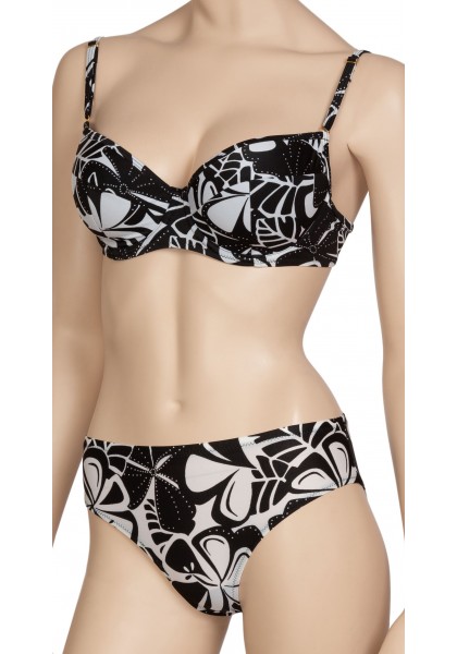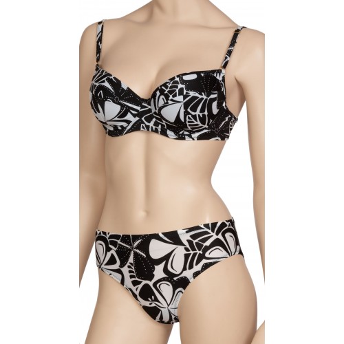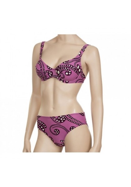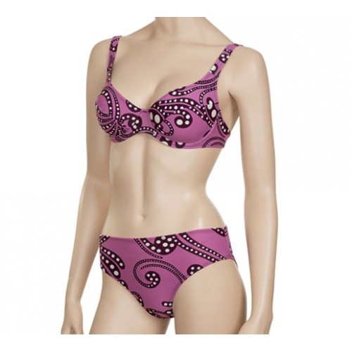 Бюстгальтер на подкладке из дублированного полотна. Бретель эластичная, регулируемая. Застежка сзади на пряжку. Трусы с ластовицей на подкладке из эластичного полотна. Все срезы трусов обработаны эластичной резиной для купальников.