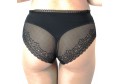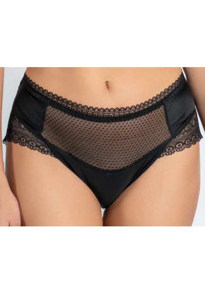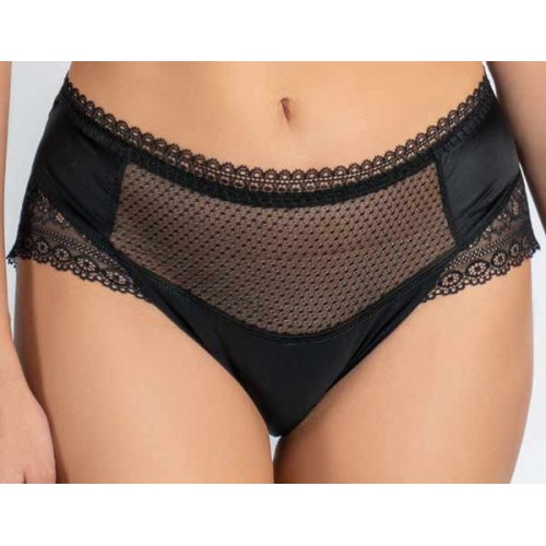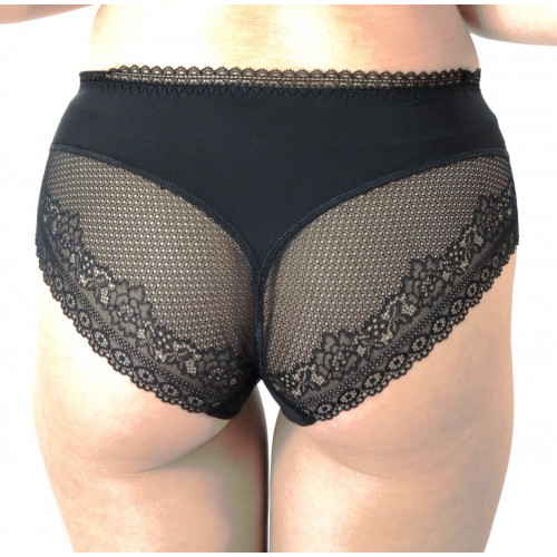 Трусы классические средней посадки из эластичного кружева и нежного эластичного полотна. Верхний срез трусов декорирован узким эластичным кружевом, усилен эластичной отделочной лентой. Срезы ног без дополнительной обработки, а боковые швы перенесены на переднюю деталь, что делает их незаметными под верхней одеждой. Ластовица на подкладке из хлопчатобумажного трикотажного полотна. Трусы сочетают в себе комфортную комбинацию полотен передней части и эластичного кружева сзади.