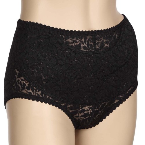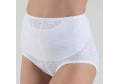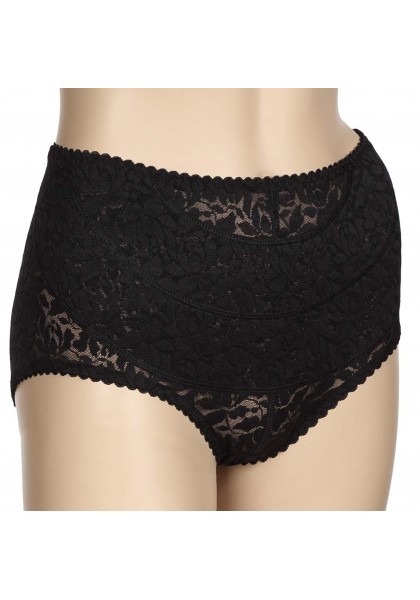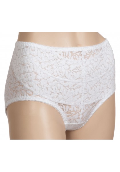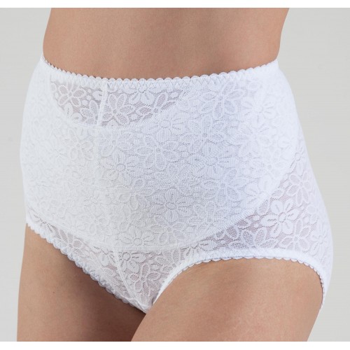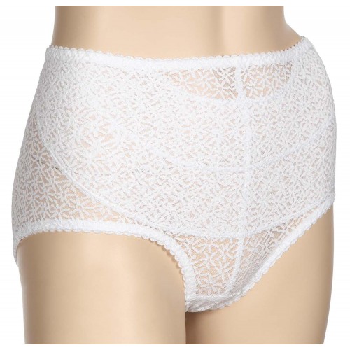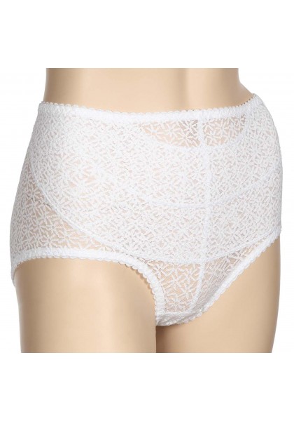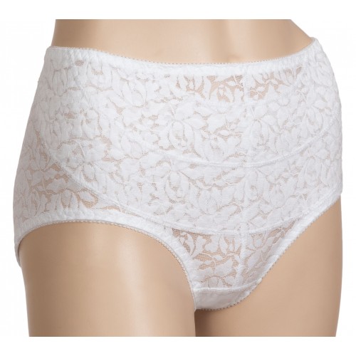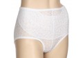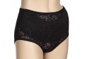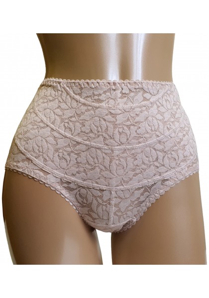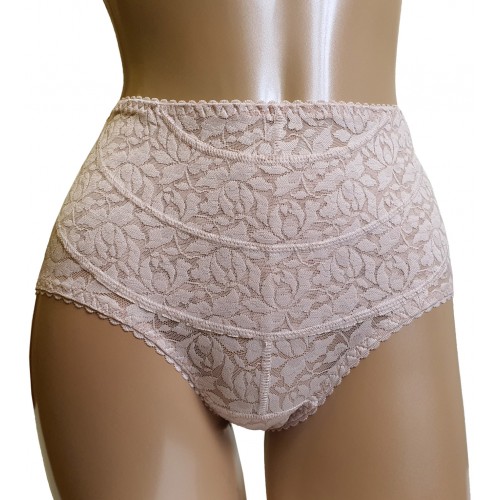 Высокие утягивающие трусы из кружевного эластичного полотна с дополнительной объемной утяжкой в области живота. Ластовица на подкладке из хлопчатобумажного полотна. Все срезы трусов обработаны эластичной лентой.